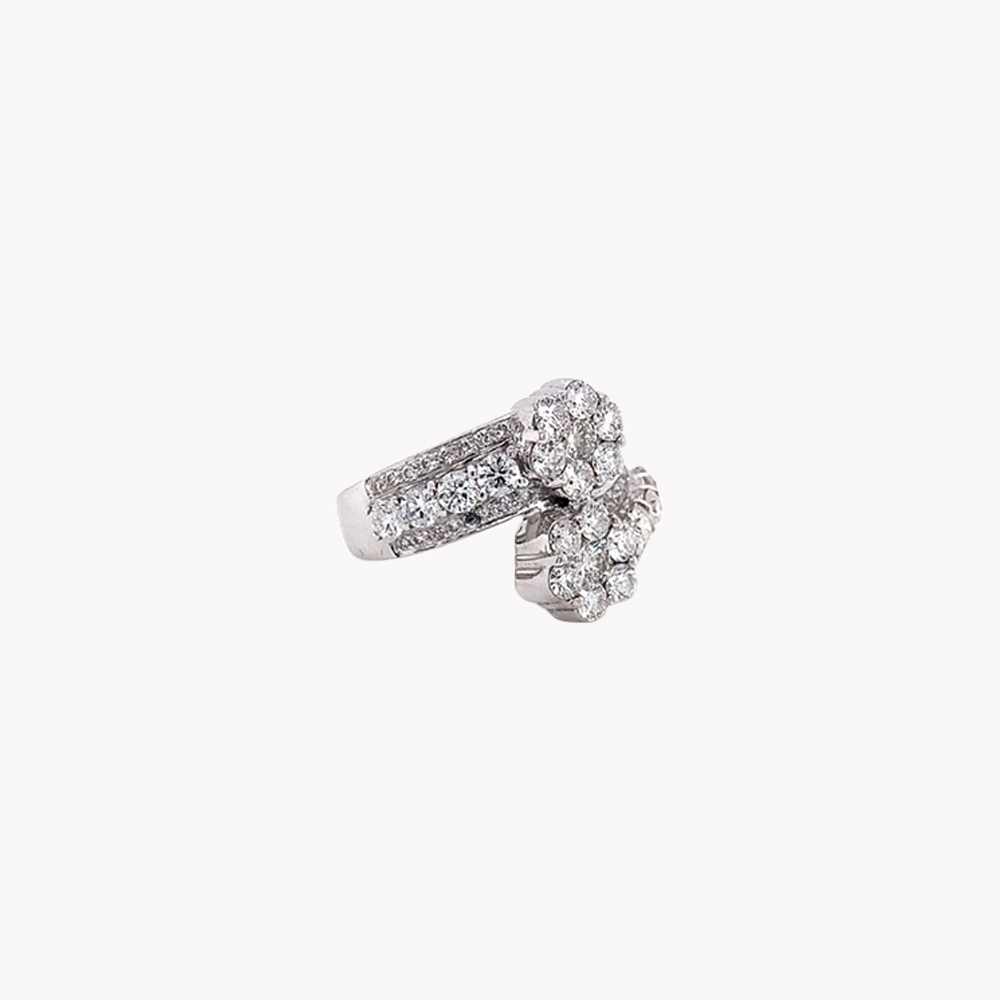 Anello “DOUBLE FLOWER” contrarié in oro bianco 18kt e diamanti bianchi rotondi taglio brillante: