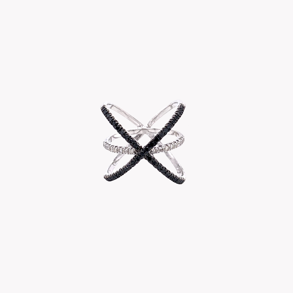 Anello in oro bianco 18kt con incrocio di diamanti neri e diamanti bianchi: