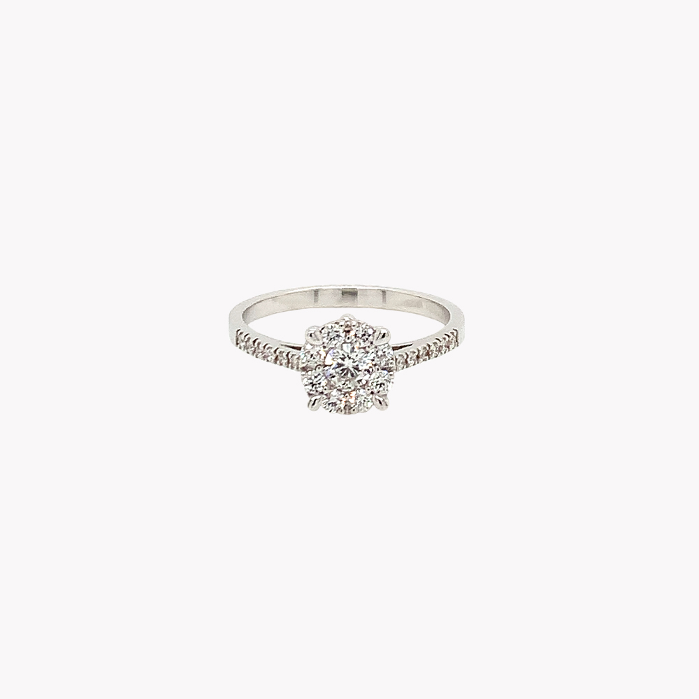 Anello Magic in oro bianco 18kt e diamanti bianchi. Pietra centrale rotonda taglio brillante di 0.05ct, 0.10ct o 0.20ct circondata da pavé di diamanti bianchi: