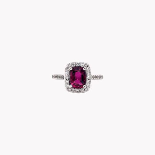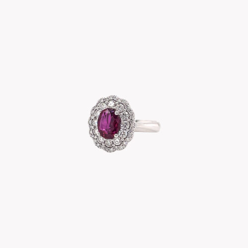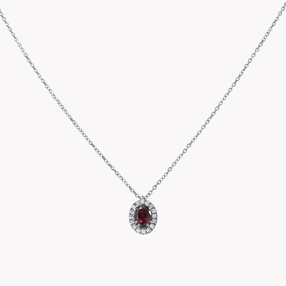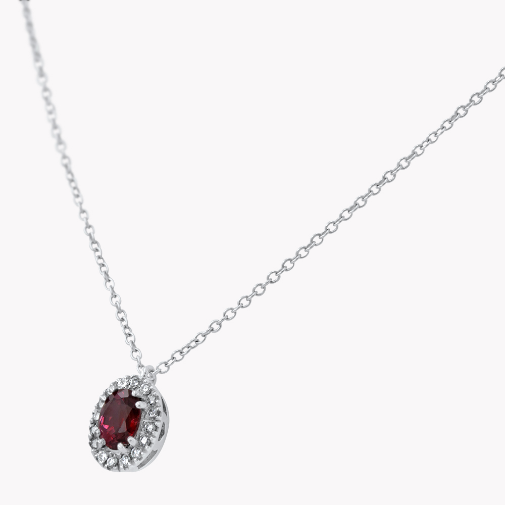 Collana in oro bianco 18kt con rubino taglio ovale contornato da diamanti taglio brillante: