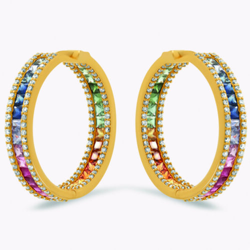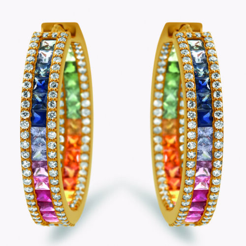 Orecchini monachella “4 file” in oro bianco, giallo o rosa 18kt e pavé di diamanti bianchi o neri rotondi taglio brillante. La variante diamanti neri è in oro bianco 18kt rutinato:
