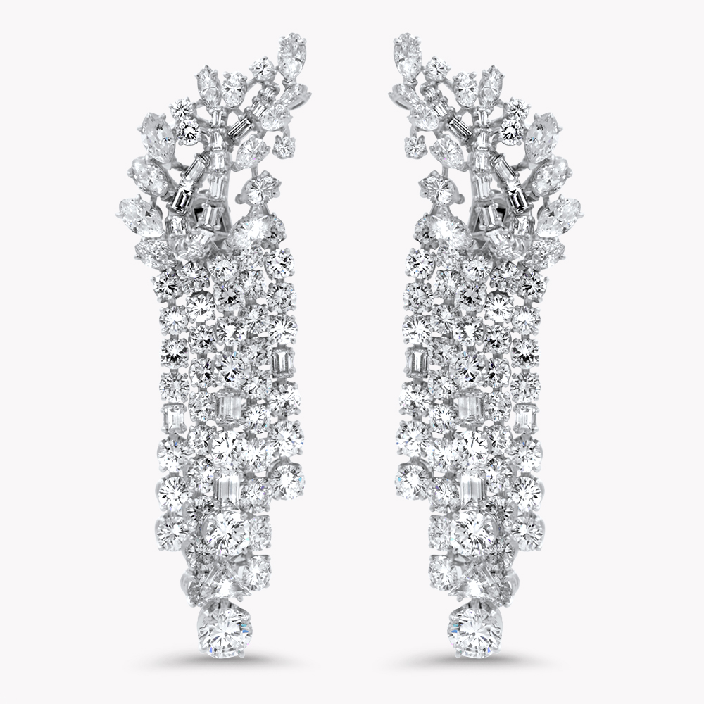 Orecchini pendenti in oro bianco 18kt e mix di diamanti taglio brillante, marquise e baguette di varie dimensioni. Chiusura con clip: