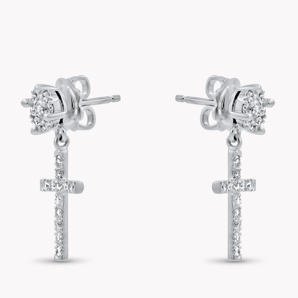 Orecchini pendenti “Cross” in oro bianco 18kt, set di diamanti bianchi a lobo con pendente croce in pavé:
